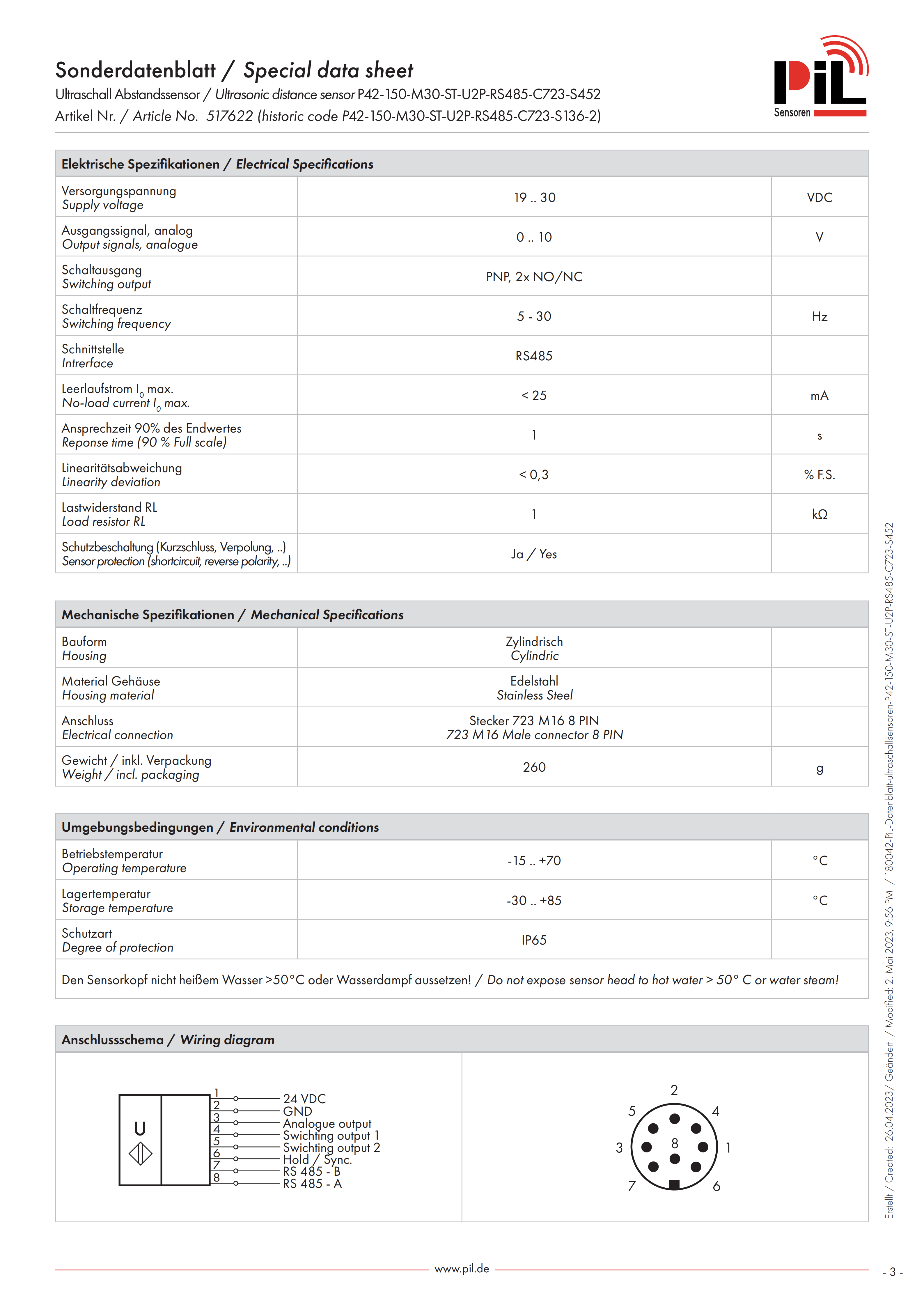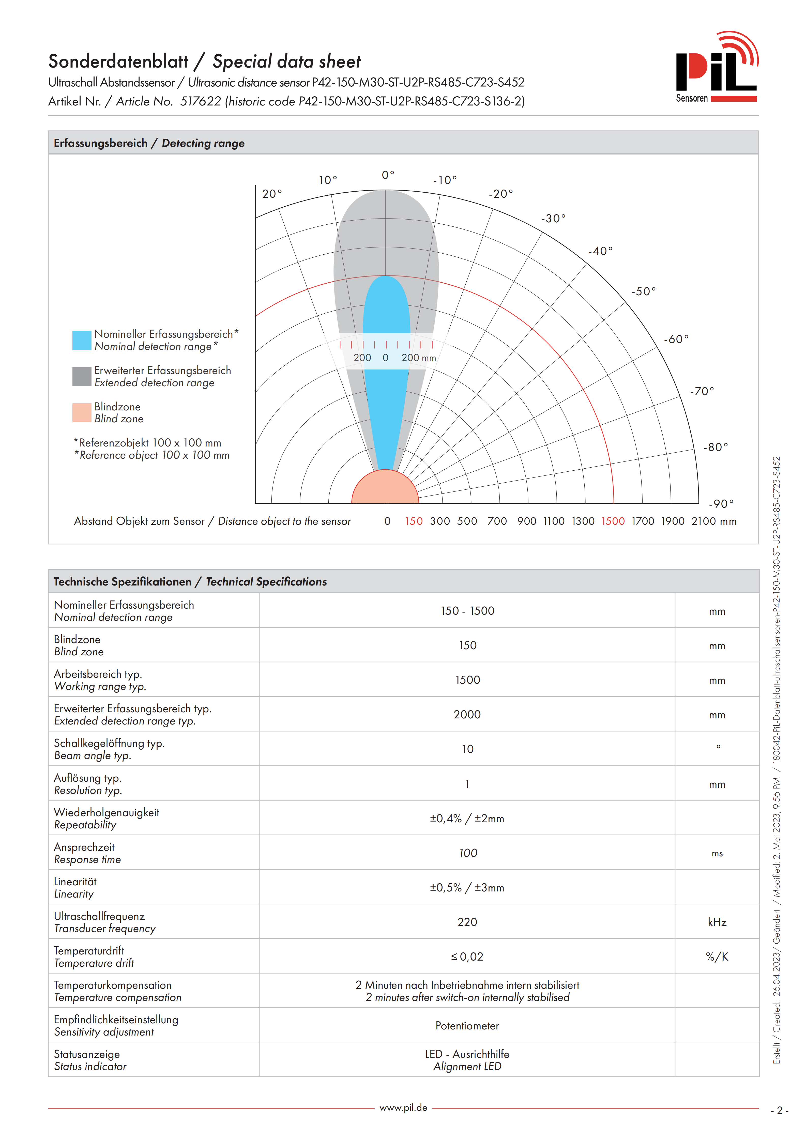 PIL Ultraschall Abstandssensor / Ulrasonic distance sensor P42-150-M30-ST-U2P-RS485-C723-S452 Artikel Nr./Article No.517622 (historic code P42-150-M30-ST-U2P-RS485-C723-S136-2)