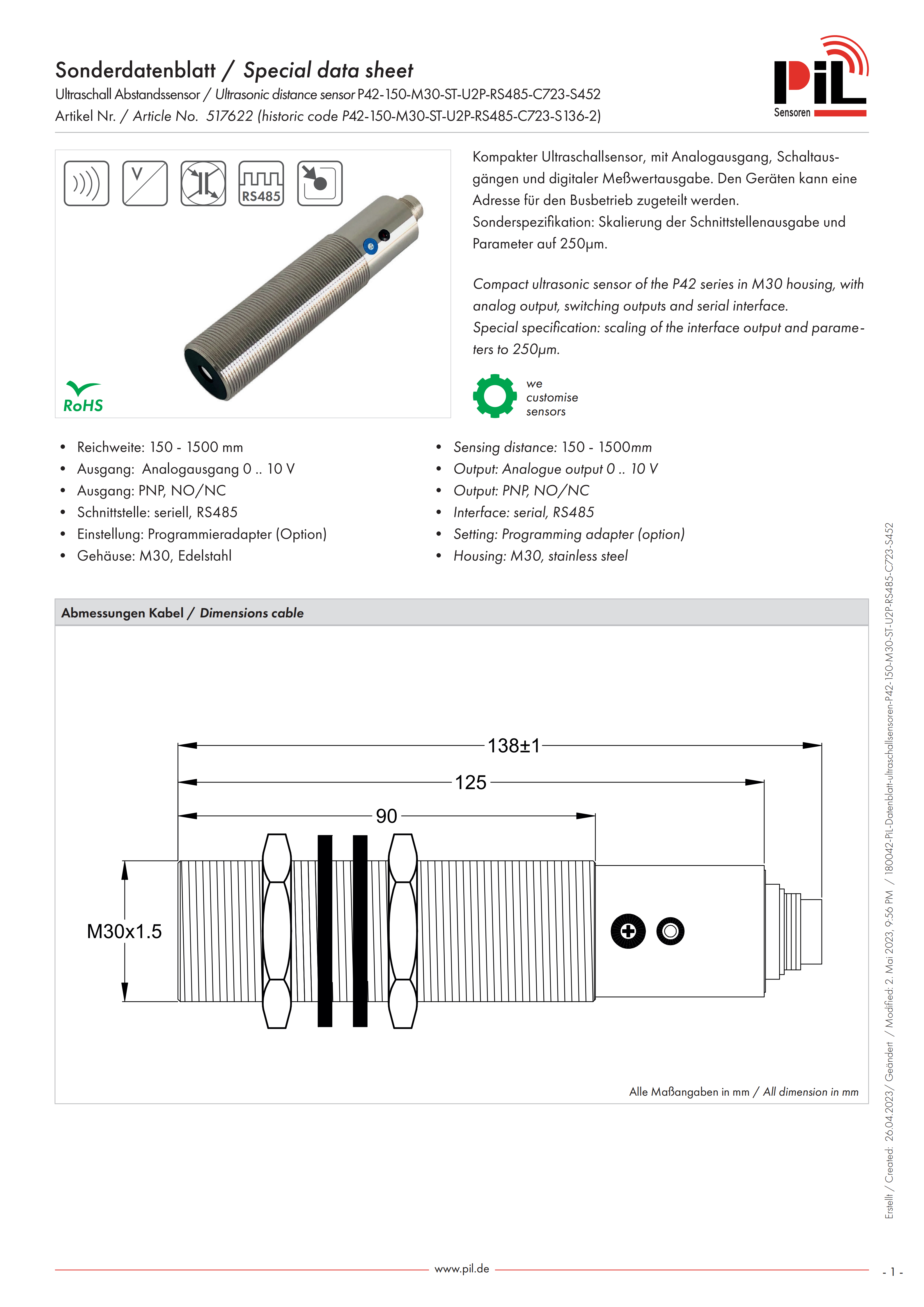 P42-150-M30-ST-U2P-RS485-C723-S452 Artikel Nr./Article No.517622 (historic code P42-150-M30-ST-U2P-RS485-C723-S136-2)